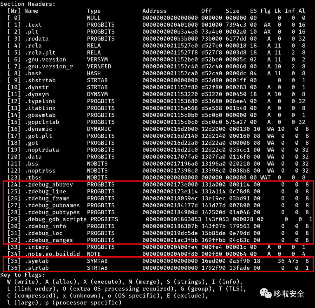 加上此参数的时候会删除`.zdebug` 调试部分,通过对顶部低位(Off 列)地址相减,达到减小二进制文件大小的目的。