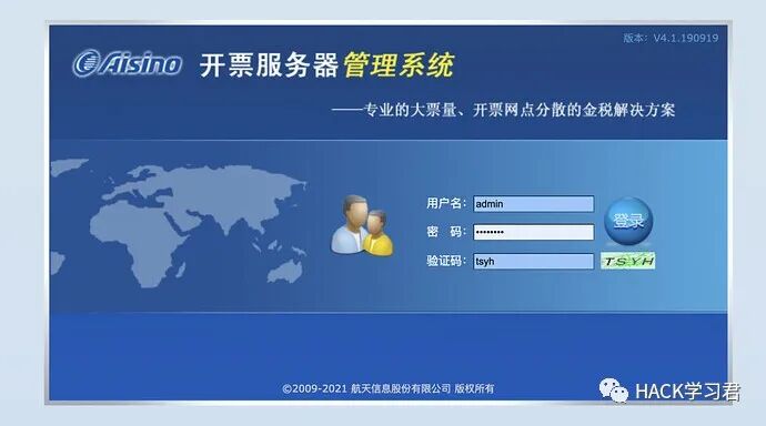 这个时候把目光放在了开票服务器和范围OA,简单看了下发票服务器有个弱口令进到后台: