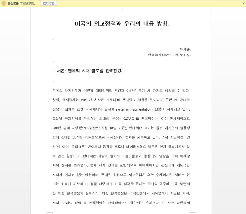 近日,研究人员发现了上传到VirusTotal的Kimsuky攻击样本。样本为宏文档,文件名:미국의 외교정책과 우리의 대응방향.doc(MD5:4de19e2c39b1d193e171dc8d804005a4、通信URL:hxxp://uppgrede.scienceontheweb.net/file/upload/list.php?query=1)。下图是宏文档的截图。