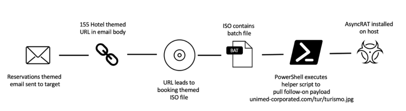 Proofpoint研究人员披露以经济利益为目的新APT组织TA558。该组织至少从2018年4月开始活跃,目标位于拉丁美洲、北美和西欧地区。TA558擅长伪装成酒店邮件进行附件钓鱼完成初始接入。在数次攻击活动中,TA558使用了至少15个不同系列的恶意软件,最常见包括Loda、Vjw0rm、AsyncRAT和Revenge RAT。下图是该组织2022年活动攻击链。