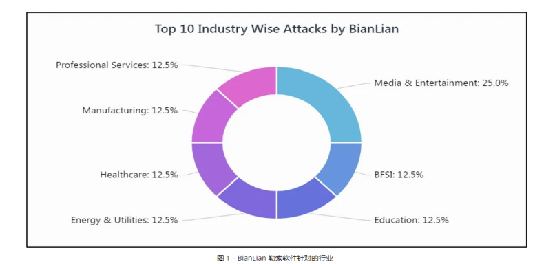 Cyble研究人员观察到,BianLian勒索软件已针对制造、教育、医疗保健、BFSI(银行、金融服务和保险)等多个行业开展攻击活动。该勒索软件会对目标主机上的关键文件进行加密,并修改其后缀为”.bianlian“,最后勒索软件会删除自身。感染成功后,受害者会收到有关如何恢复其加密文件的说明。下图是BianLian勒索软件针对的行业的分布情况。