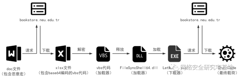 近日,安恒信息猎影实验室捕获到数个针对土耳其海军的钓鱼文档样本,经过对样本的分析发现,其与2021年4月26日披露的“Actor210426”行动攻击手法高度重合,因此推断两次攻击为同一组织的可能性极大,并命名为APT-N-04(又名穆伦鲨)。该组织至少从2021年开始活跃,主要目标是土耳其的科研机构,在此次攻击活动中,攻击者发送带有恶意宏的诱饵文档,启用宏后执行VBA代码开展攻击活动,下图是攻击流程图。
