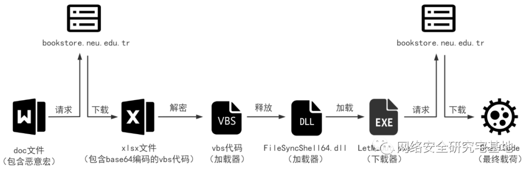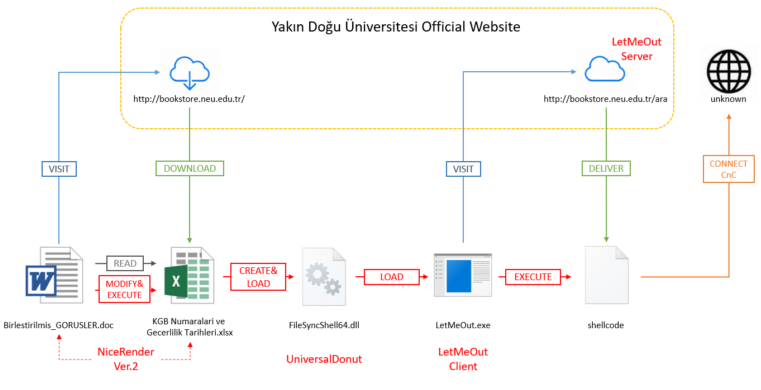 穆伦鲨使用三种主要攻击组件NiceRender、UniversalDonut、LetMeOut以及第三方攻击工具CobaltStrike,最终实现窃取受害者主机中的数据、以及在受害者主机所在域内进行横向移动的目的。该组织在近期针对土耳其海军与科研机构的攻击活动中使用的新流程如下:
