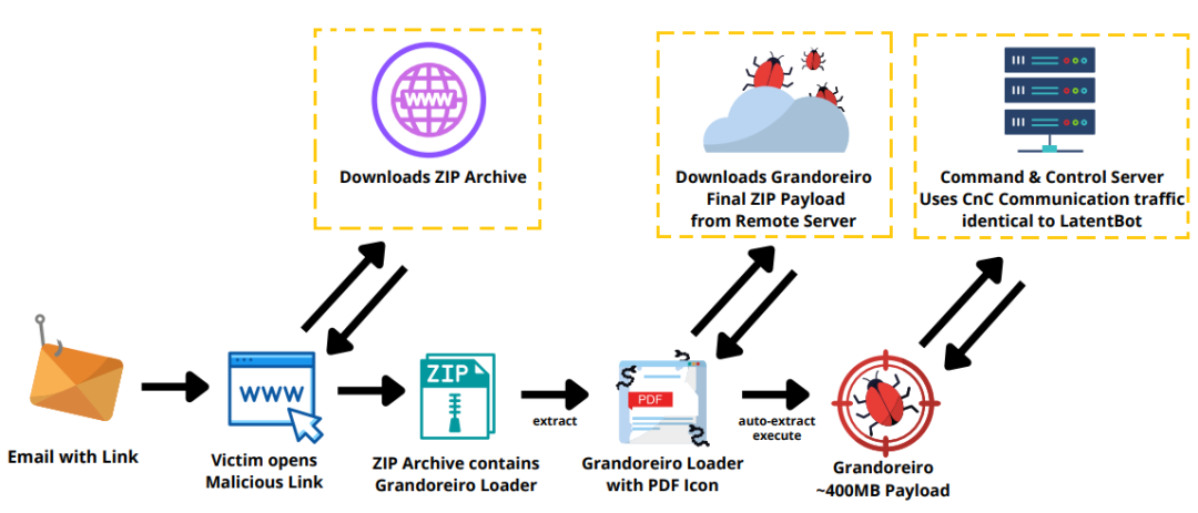 此次活动中,攻击者冒充墨西哥政府官员,以鱼叉式网络钓鱼电子邮件的形式诱使受害者下载并执行“Grandoreiro”银行木马,该电子邮件包含一个嵌入式链接,单击该链接会将受害者重定向到一个网站,该网站会在受害者的计算机上进一步下载恶意ZIP存档,ZIP存档与带有PDF图标的Grandoreiro加载器模块捆绑在一起,以引诱受害者执行。根据攻击者使用的诱饵,网络钓鱼电子邮件分为两组:冒充政府官员,指示受害者下载和分享临时存档决议的电子邮件、取消按揭贷款及存款凭证两种形式。此外Grandoreiro由Delphi编写,利用二进制填充方式膨胀二进制文件以及验证码等多种反分析技术来实现沙盒规避,并使用与 LatentBot相同的模式的命令和控制(CnC)通信。