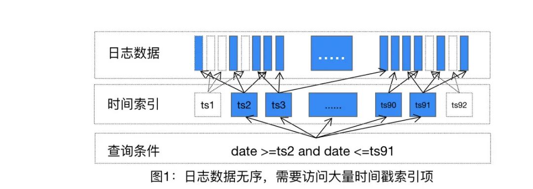 首先,在大方向上,我们改变了数据的组织方式,通过对日志按照时间戳排序来加快对时间范围的搜索。在原来的索引中,日志的时间戳是无序的,对于指定时间范围的检索需要处理大量的时间戳索引项(几十万到上亿),我们通过时间戳有序化将时间范围检索简化为只需要对时间范围的端点进行处理(处理的时间戳索引项从几十万/上亿降低为 2 个)。如下图所示: