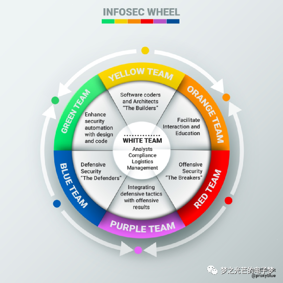 我们参考@aprilwright的信息安全色轮能发现,涉及安全的角色划分达到7个之多。除了我们熟知的“攻”(红色)与“防”(蓝色),还有紫色团队负责攻防演习的组织;黄色团队也就是业务方,负责安全策略和措施的落实,有很多业务团队还有自己的安全官;处于红黄之间的橙色团队,负责促织安全互动和培训教育;处于黄蓝之间的绿色团队,负责通过提升设计、编码、自动化检测来提升安全能力;此外还有白色团队,负责分析安全报告与态势、制定安全策略与规则、进行安全管理动作等工作。当然,对于绝大部分企业来说,不能成立这么多安全团队,不过即便对于单个安全团队来说,上述的角色与分工依然是必不可少的。