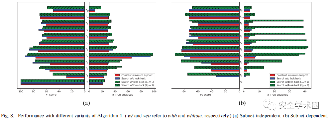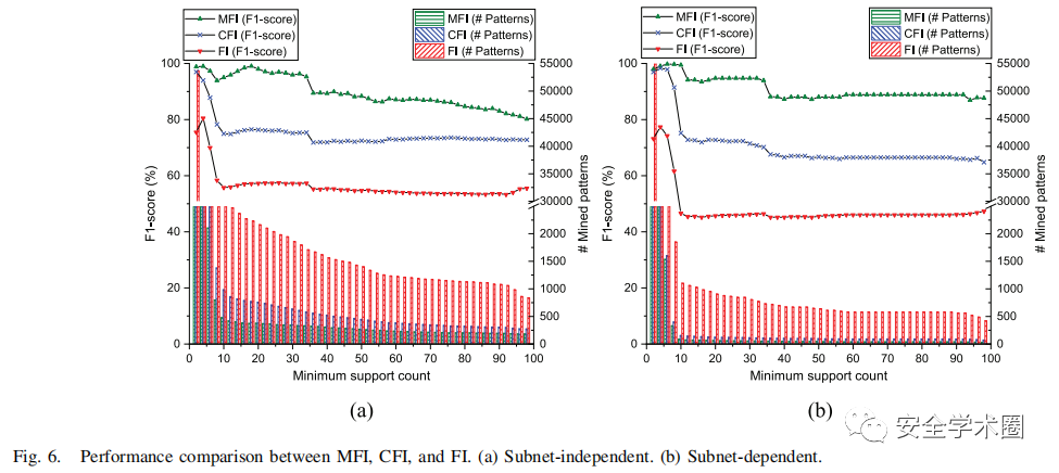 实验一:对比了对警报应用子网划分和不应用子网划分两种IP地址表示方法对效果的影响,应用子网划分方式的F1值更高且能识别出更多的模式。