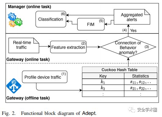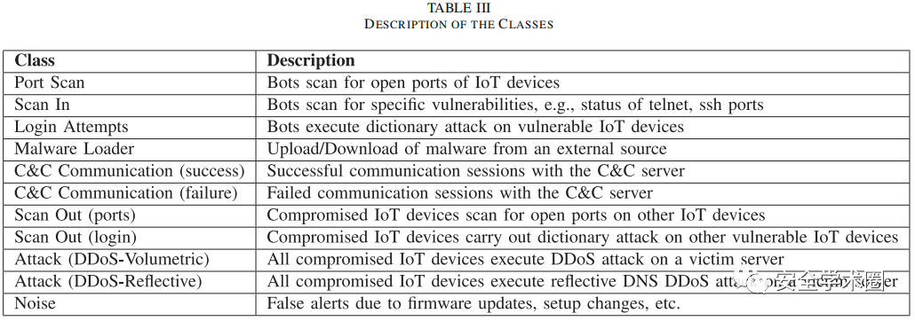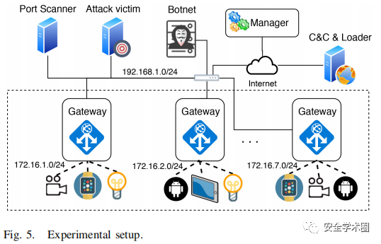 离线操作:建立哈希表存储与网关连接的物联网设备的配置表以检测设备变化,由于设备的正常行为可能随时间推移而改变,例如固件更新,因此定期(几天为周期)更新哈希表。 在线操作:分析设备流量以检测异常(连接异常和行为异常),生成流量异常的元信息(警报),网关向上只发送警报。减少了带宽消耗和私人信息泄露风险。 基于频繁项集挖掘(FIM)提取攻击阶段相对应的模式同时过滤由于固件更新等产生的虚假警报。 提出了一种基于滑动窗口的挖掘算法,基于当前时间窗口中发现的新模式来发现先前时间窗口中遗漏的模式,使得ADEPT能考虑到时间相关性。 第三阶段:使用警报级别和模式级别的特征训练基于机器学习的多分类模型。 模式级别特征:IP和端口流量方向、向内和向外的平均数据包大小、FIM阶段的支持度、源节点与目标节点的数量比、每个IP的交互端口数量、模式识别中的特殊属性、实体。 攻击阶段类别: 实验 作者模拟了一个物联网网络和Mirai攻击环境,实验装置:一台安全管理器、65台IoT设备、一台靶机、两个外部僵尸网络、一台C&C服务器、一台装载机、一组虚拟机(触发警报)。