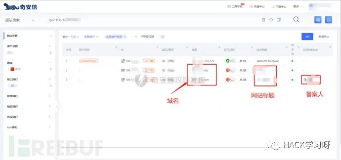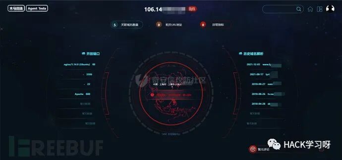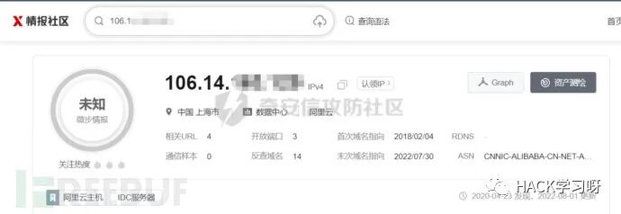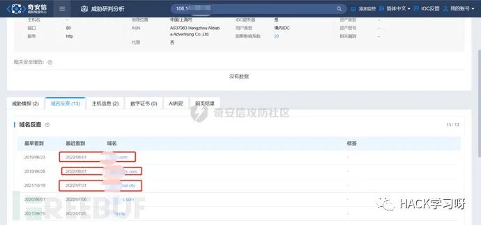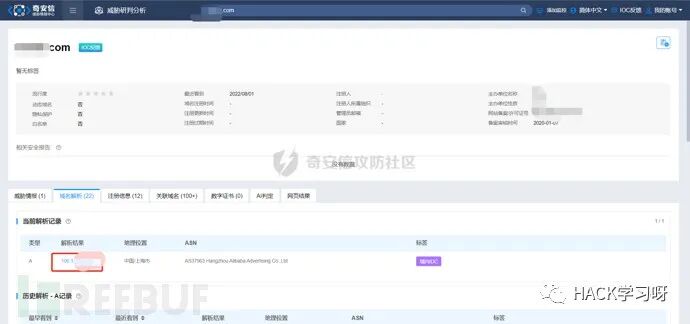 在前面威胁情报收集之后,该IP是阿里云的一台云服务器,推测应该属于个人的服务器,于是对IP反查绑定的域名,若存在域名,便可以查询域名备案信息,从而溯源到攻击者。