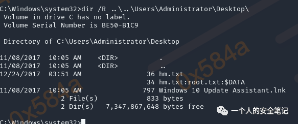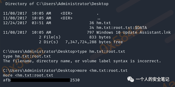 怀疑存在隐藏,在 dir 中加入 /R 参数出现 hm.txt:root.txt:$DATA 文件。
