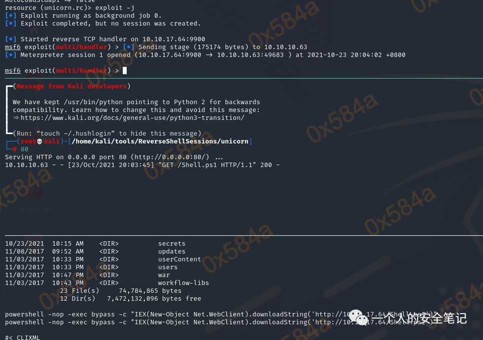 在信息收集过程中发现 Shell 连接不稳定,就改用 MSF 进行会话维持。本地起一个 Web 服务,PowerShell 加载运行完成上线:
