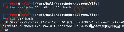 john ./CEH.hash -w /usr/share/wordlists/rockyou.txt --format=KeePass运行后发现无法解出来,改为用 hashcat 又进行了一次,结果能成功得到明文密码。