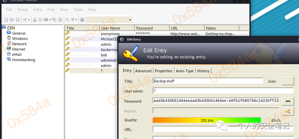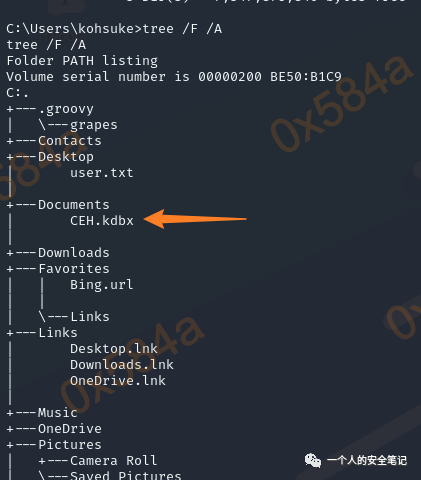 users\admin\config.xml: <passwordHash>#jbcrypt:$2a$10$QyIjgAFa7r3x8IMyqkeCluCB7ddvbR7wUn1GmFJNO2jQp2k8roehO</passwordHash>可惜解不开,随后使用 tree 命令查看下文件夹树形信息,发现存在一个 CEH.kdbx 文件。根据文件后缀名进行搜索,得知它是 Windows 免费密码管理器 KeePass Password Safe 创建的文件,用来存储密码的加密数据库,该数据库只能使用用户设置的主密码进行查看。