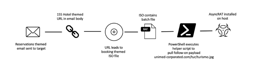 TA558 是一个具有经济动机的威胁组织,旨在针对拉丁美洲展开攻击。自 2018 年以来,该组织一直使用一致的策略、技术和程序来尝试安装各种恶意软件展开攻击,包括 Loda RAT、Vjw0rm 和 Revenge RAT等恶意软件。2022年,TA558 与其他威胁组织一样开始转向使用新的策略、技术和程序,而不再使用包含宏的文档发起攻击。近日,ProofPoint 研究人员监测发现 TA558 组织在新的攻击活动中利用附件和 URL 分发多种恶意软件载荷等策略展开攻击。威胁组织使用 RAR 和 ISO 附件等容器文件等策略以应对微软 Office 产品中默认禁用宏这一转变。该组织开始更频繁地使用 URL,通过 URL 链接下载 ISO 镜像文件和嵌入式批处理文件,利用脚本下载后续有效负载 AsyncRAT 执行恶意攻击,然后通过计划任务实现在受害者设备上的持久性。