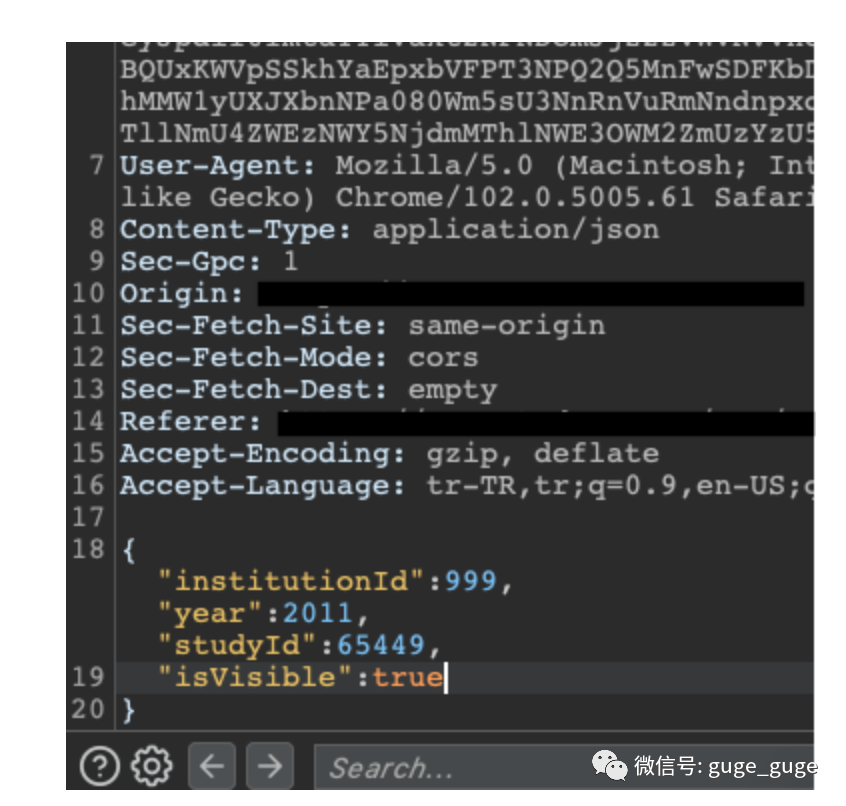 3、抓包如上,我们似乎并没有看到任何感兴趣的内容,因此发送该请求并查看了响应包,在响应包中,我们可以看到一个参数“isVisible”被设置为 false
