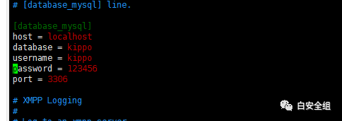 改:163 #[database_mysql]164 #host = localhost165 #database = kippo166 #username = kippo167 #password = secret168 #port = 3306为:[database_mysql]host = localhostdatabase = kippousername = kippopassword = 123456port = 3306