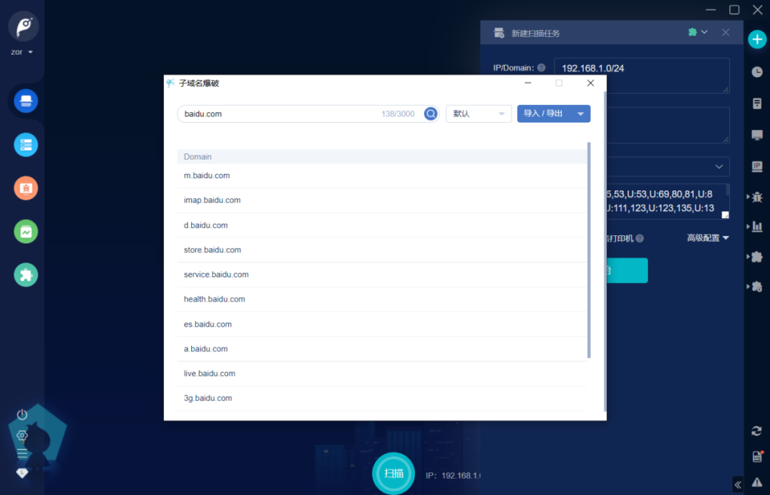 导入自定义的子域名字典后,只需要在输入框键入目标域名,点击扩大镜按钮,便可在极短的时间内获取到准确的子域名信息。
