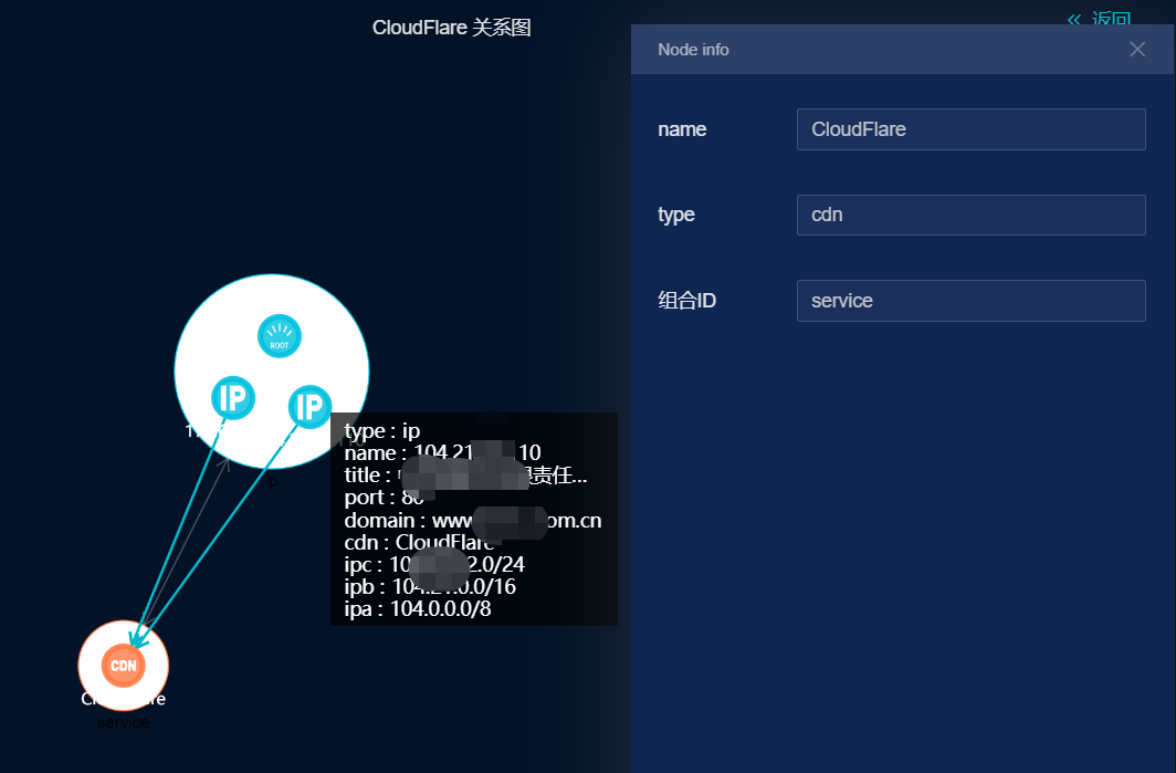从图 15 中左下角的橘色小圆点中,我们看到,这次资产搜集还有意外的收获。这些橘色小圆点代表的是这些资产中使用了 CDN 加速服务,而且连使用哪个厂家都标注出来了。右击选择橘色小圆点,点击查看关系,就能看到是哪些资产使用了 CDN 加速。