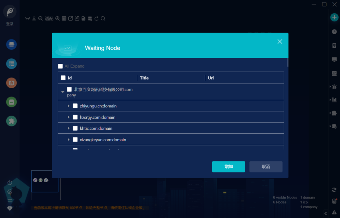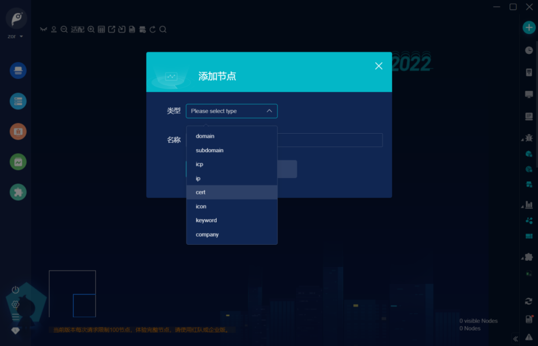 从上图中可以看到,可以添加的节点类型有:域名、子域名、ICP 备案信息、IP 地址、icon 值、关键词、公司名称。