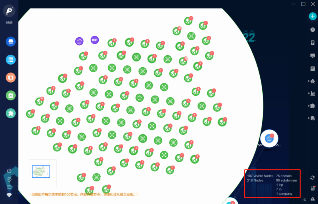 然后右键点击 company 节点中的公司名称,可以看到下图 6 中的几个选项,我们可以依据这个 company 节点再继续扩充我们的资产信息,选择第一个选项“导入dommain/ip”,可以得到图 7 的结果,与该公司名关联查询到的域名信息结果都会在上面显示,我们可以人工选择准确的资产(点击域名前的小方框)进行添加。选择资产添加后,如图 8 所示,所有的资产关联关系都能从图中看到,图 8 中右下角的红框中可以看到,就这么一分钟时间,我们已经从一个域名,关联搜集到了 75 个主域名、90 个子域名以及 7 个 IP 地址信息。这个功能是不是超棒的!而且使用起来非常的方便,不需要记什么命令,只要伸出小手点点鼠标即可。