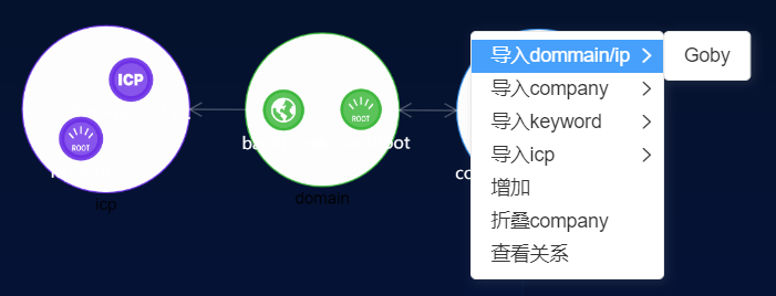 现在,让我们试着创建一个“域名”节点,探索一下这个神奇的功能吧。创建完成节点后,右击绿色图标中的 root 图标,可以看到如下图所示,Goby 可以以域名“XXX.com”为根节点,从以下几个方向扩展资产面:子域名、IP 地址、ICP 备案信息、cert 信息。