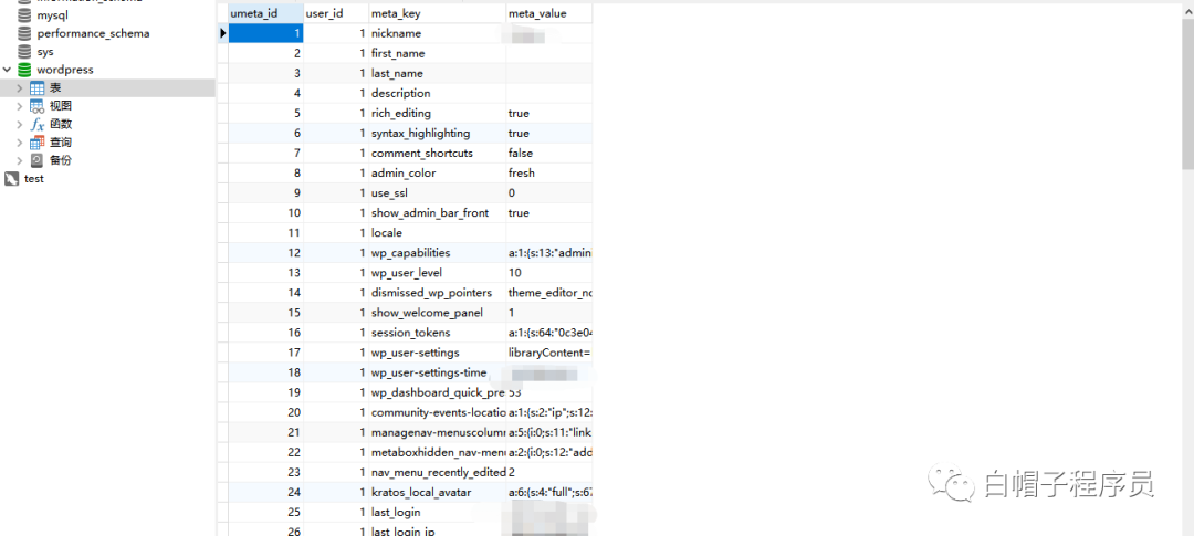 接着翻了一下数据库,发现有一个wp_usermeta的表很特殊,我怀疑这是不是分配用户权限的地方