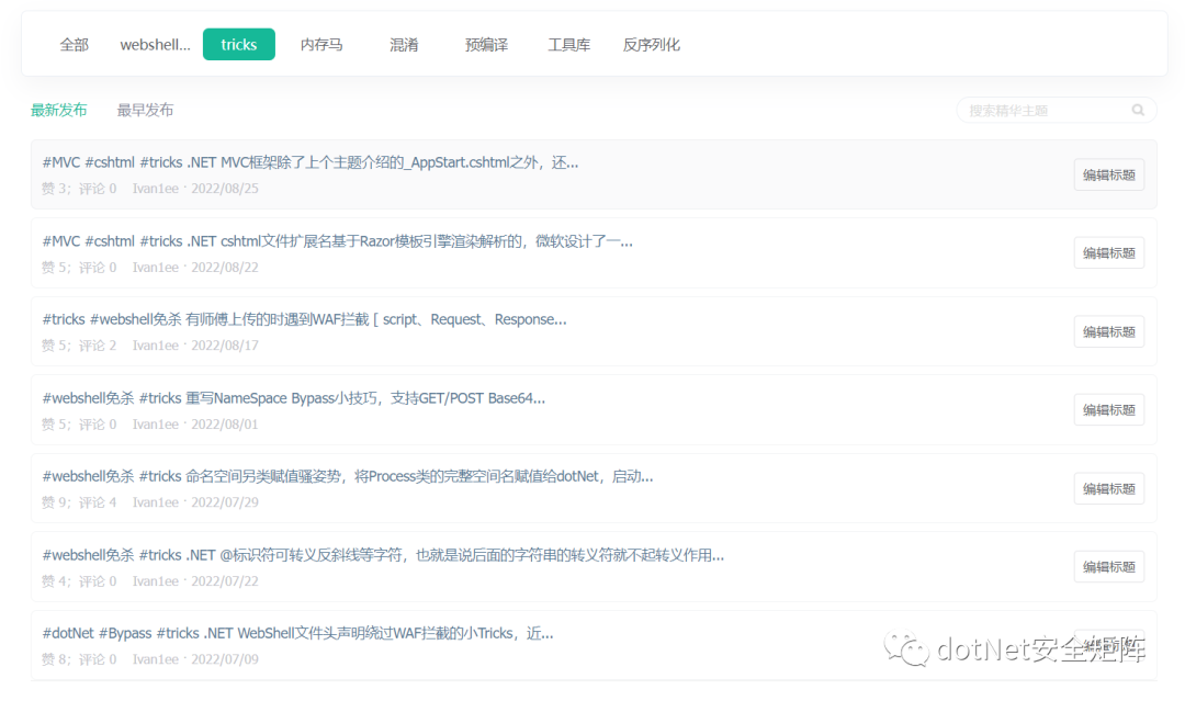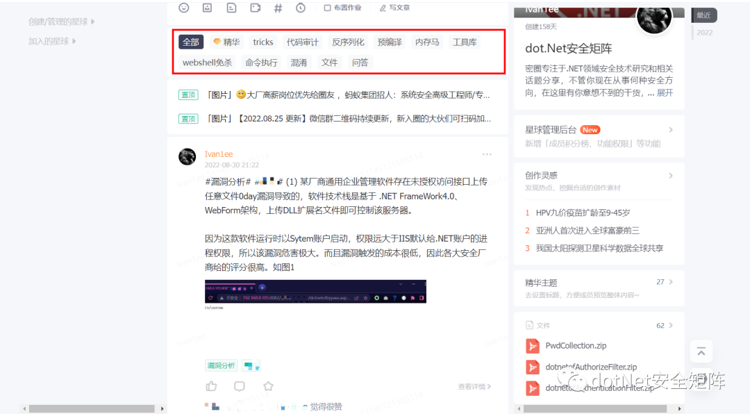 星球汇聚了各行业安全攻防技术大咖,并且每日分享.NET安全技术干货以及交流解答各类技术等问题,社区中发布很多高质量的.NET安全资源,可以说市面上很少见,都是干货。其中主题包括.NET Tricks、漏洞分析、内存马、代码审计、预编译、反序列化、webshell免杀、命令执行、C#工具库及0day等等,后续还会倾力打造专刊、视频等配套学习资源,循序渐进的方式引导加深安全攻防技术提高以及岗位内推等等服务。