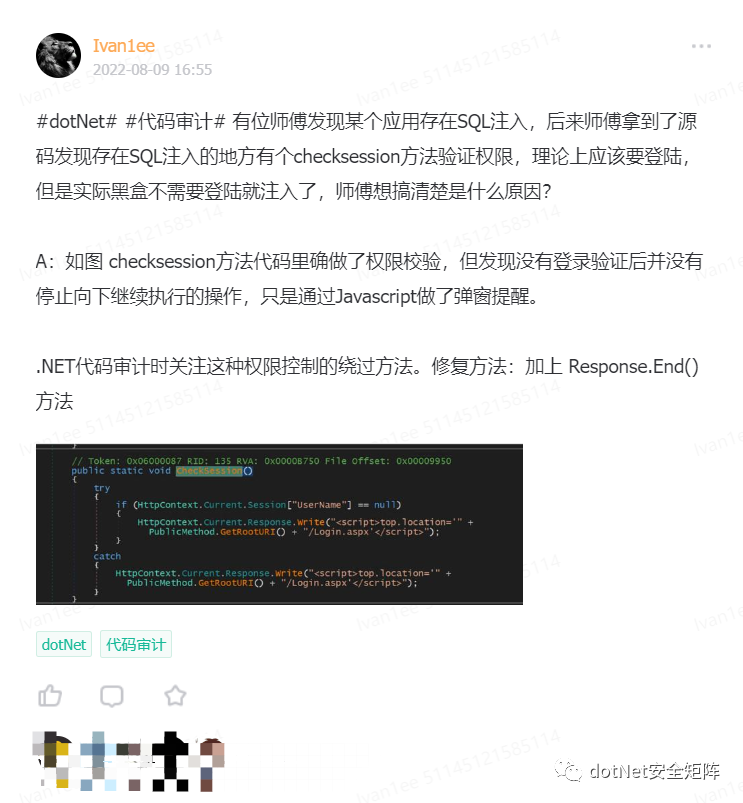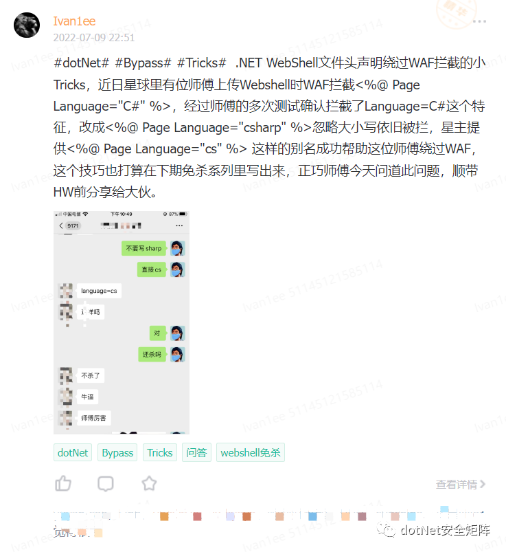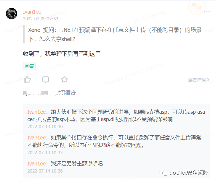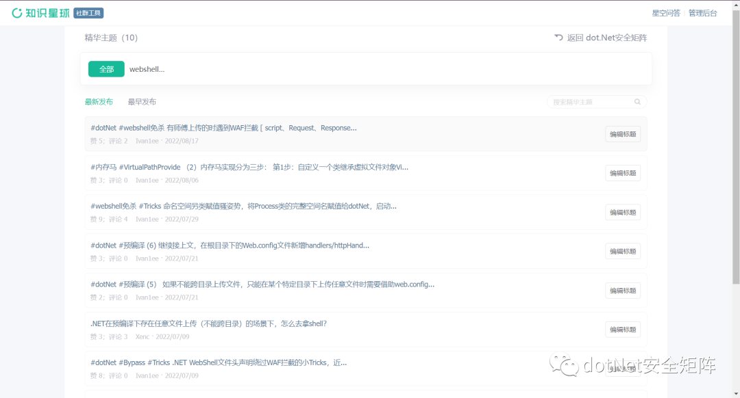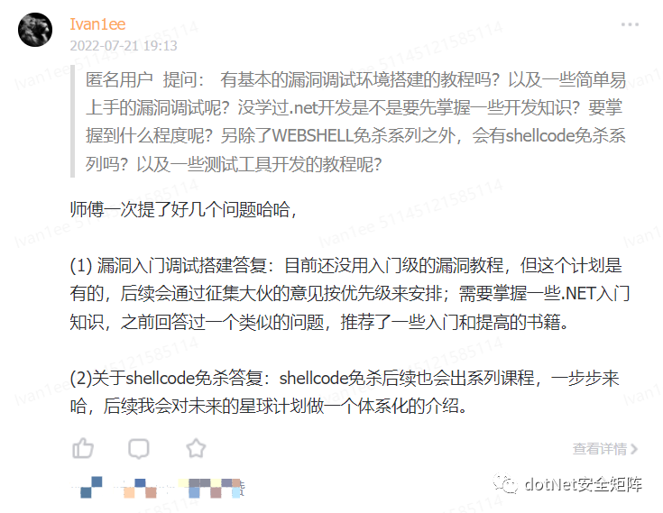 术业有专攻,我们聚焦于.NET领域的安全攻防技术,无论你是刚入门的小白,还是在某一个领域已经深耕多年的老师傅,在.NET技术和学习上都或多或少的会遇到一时无法解决的问题。对此可以利用知识星球“提问”和“标签”的功能,你们进行提问由星主或嘉宾们进行解答。我们接下来的目标也是将知识星球打造成一个“问答社区”。在这里,我们会尽力地解决你遇到的问题,你也能与其他人交流讨论你感兴趣的话题。参与问答的同时也是对自己知识的一次梳理与巩固。接下来分享几篇星球小伙们的优质问答