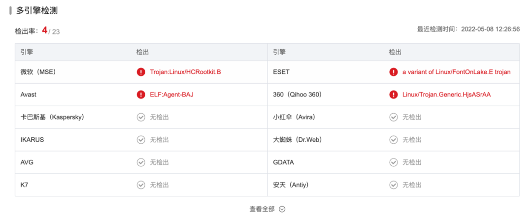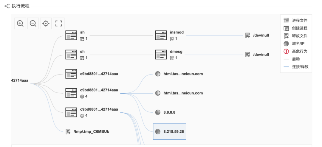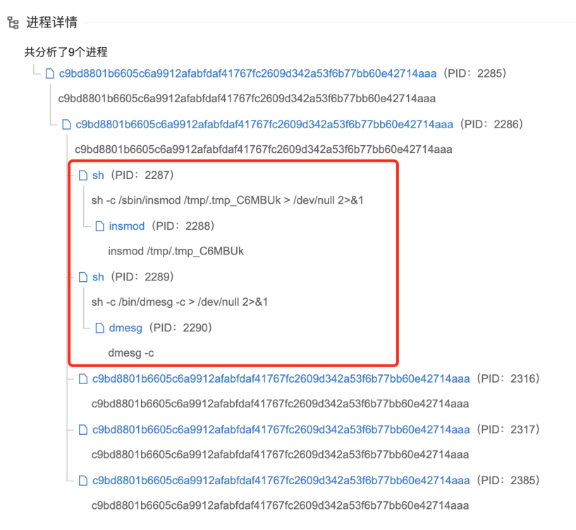 样本的多杀软引擎判定结果,其中 ESET 将该样本识别为 FontOnLake 恶意软件。样本的执行流程,其中有将模块载入 Linux 内核的敏感行为(insmod /tmp/.tmp_C6MBUk),清空 dmesg 环形缓冲区中的日志的敏感行为(dmesg -c)。![]()
