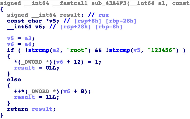 连接该机器的用户和密码设置为 root 和123456。子进程动态获取 C&C 服务器的 IP 地址和端口。该样本的请求 URL 为 http://8.218.59.26:65130/iplist。响应是 base64 解码,由 AES-128-CBC 使用密钥 M4InzQpqqC18d1KL 和 IV T4kP7mzlYR8DaLU3 解密。响应结果的格式为 <ip>:<port>,然后进行连接。![]()