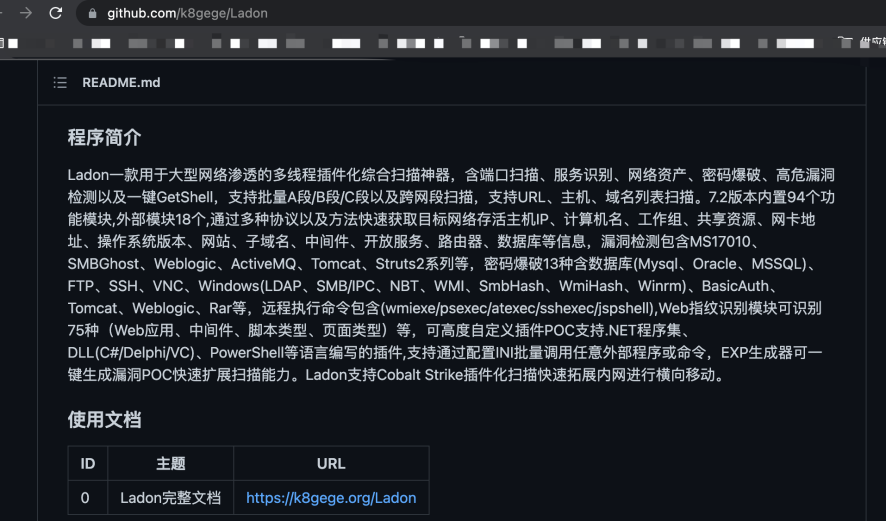 | https://github.com/k8gege/Ladon | | READNE.md为简体中文的,流行于使用简体中文的黑客人群 |