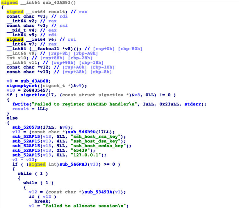 主进程进入 while 循环,执行命令 ./sshd -e ssh_host_ecdsa_key -d ssh_host_dsa_key -r ssh_host_rsa_key -p 65439 127.0.0.1。在本机监听65439端口,使用提供的 key。主进程等待子进程的结束。![]()