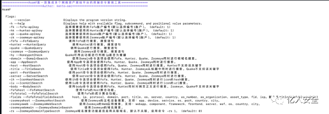 -domian、-app、-host、-title、-port、-server、-ih 这几个选项会聚合平台来搜索。具体见-h描述。
