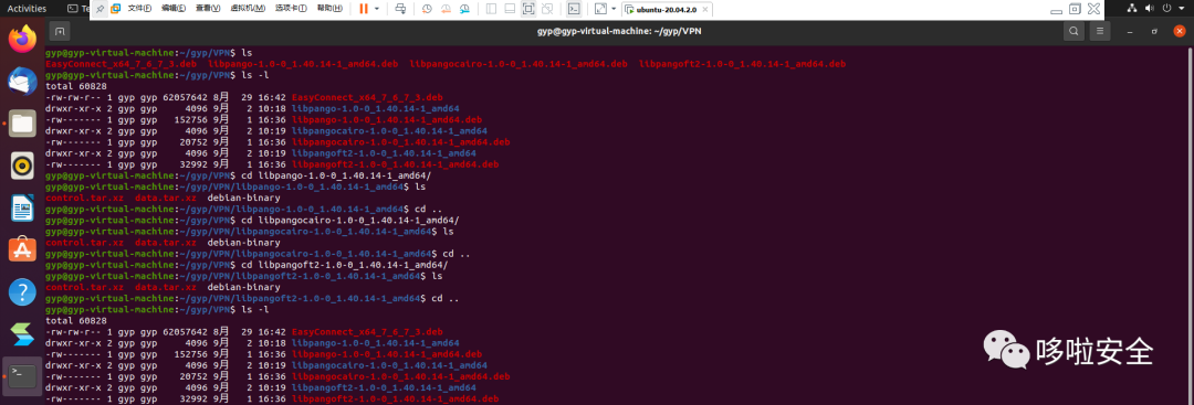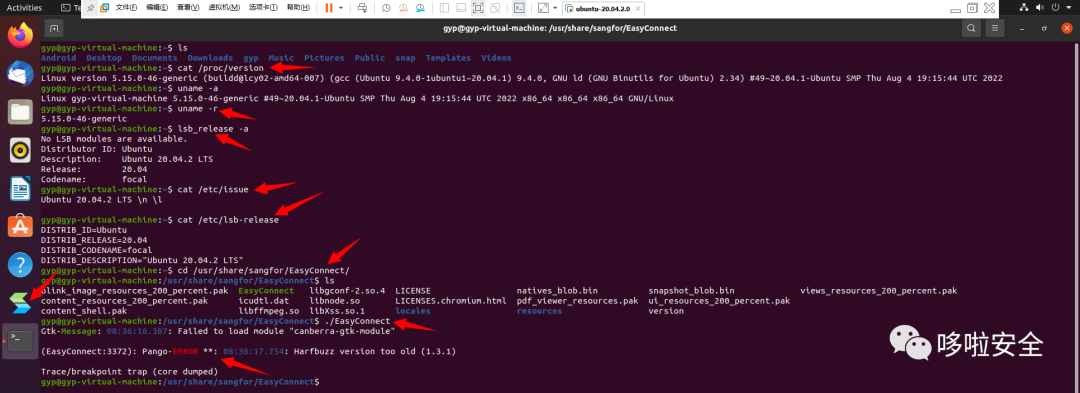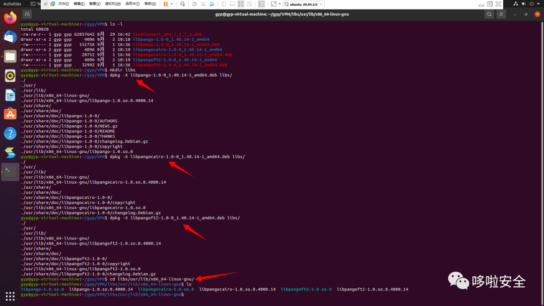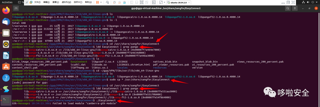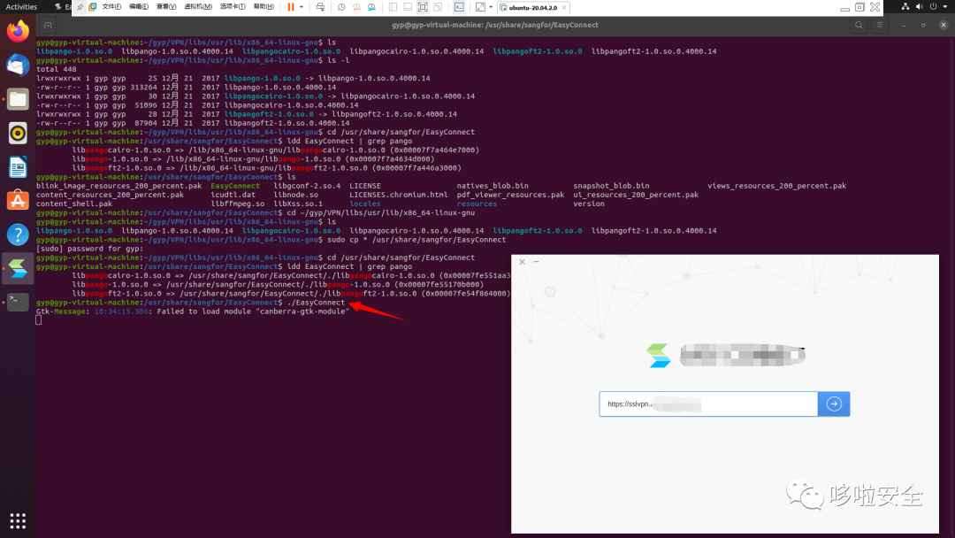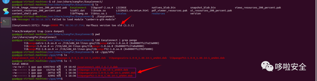 查看降级前的相关文件cd /usr/share/sangfor/EasyConnectldd EasyConnect | grep pangolibpangocairo-1.0.so.0 => /lib/x86_64-linux-gnu/libpangocairo-1.0.so.0 (0x00007f7a464e7000)libpango-1.0.so.0 => /lib/x86_64-linux-gnu/libpango-1.0.so.0 (0x00007f7a4634d000)libpangoft2-1.0.so.0 => /lib/x86_64-linux-gnu/libpangoft2-1.0.so.0 (0x00007f7a446a3000)cd ~/gyp/VPN/libs/usr/lib/x86_64-linux-gnusudo cp * /usr/share/sangfor/EasyConnect查看降级后的相关文件cd /usr/share/sangfor/EasyConnectldd EasyConnect | grep pangolibpangocairo-1.0.so.0 => /usr/share/sangfor/EasyConnect/./libpangocairo-1.0.so.0 (0x00007fe551aa3000)libpango-1.0.so.0 => /usr/share/sangfor/EasyConnect/./libpango-1.0.so.0 (0x00007fe55170b000)libpangoft2-1.0.so.0 => /usr/share/sangfor/EasyConnect/./libpangoft2-1.0.so.0 (0x00007fe54f864000)
