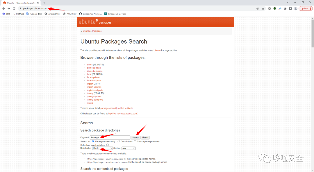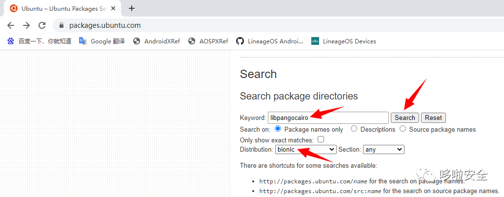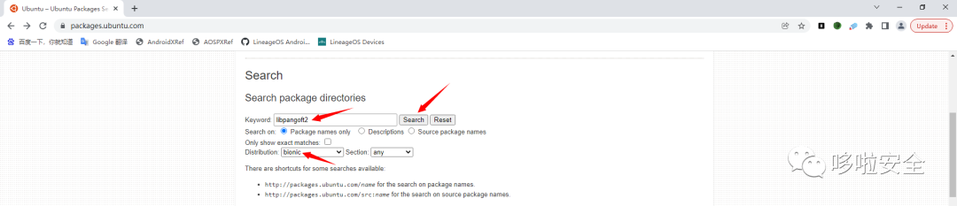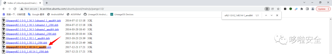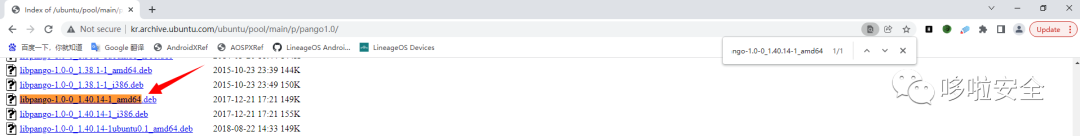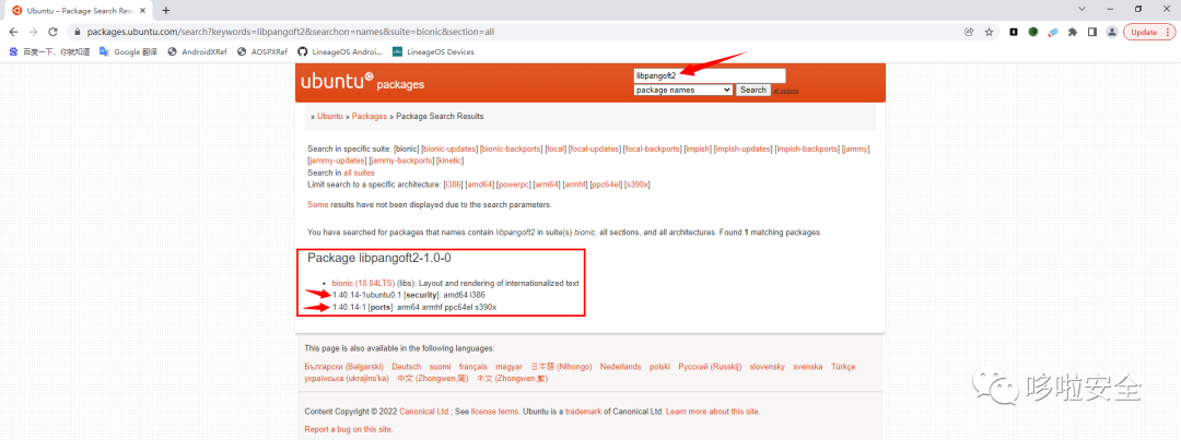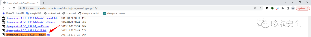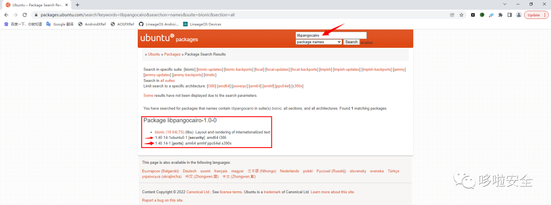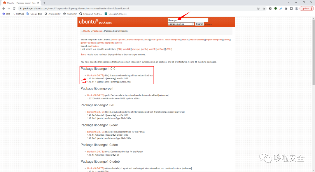 libpangocairo、libpango、libpangoft2的文件版本选择,搜索这3个需要下载的包,注意Ubuntu版本,当前安装Ubuntu20.04不能使用,所以这里选择使用18.04(bionic)