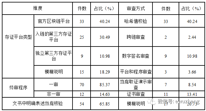 第二,当事人对区块链技术下电子证据的认可度极高。区块链技术下的证据采信率极高,在全部的样本案例中,区块链证据真实性认可率为98.9%,只有一个法院否定了易保全的区块链电子认证的效力。当然,这只能反映出一种趋势,改变搜索关键词,实践中存在其他没有采信的个案,但这一数据凸显了区块链技术下证据的高度可采性,支撑了推定真实的合理性。在全部样本中,70%的案件在一审程序终结,当事人双方认可区块链技术下电子证据的真实性。在少数的二审终审案件中,上诉人均认可区块链技术下证据的证明内容,上诉理由集中在赔偿数额过高、区块链存证未当庭验证、损害后果认定不当等问题上。第三,区块链技术下的电子证据审查方式呈现出以平台审查为主、其他方法为辅的多方式并存的状态。33%的案件是通过哈希值校验的方式进行审查,此类型中的案件全部通过天平链、司法区块链等官方区块链存证平台进行证据验证。2.44%的案件通过跨链验证的方式审查,该类型案件全部是对于入链的第三方存证平台下证据的审查,通过官方区块链存证平台审查在第三方存证平台上保存的证据,实质适用的验证技术仍属于哈希值校验。证书审查是指仅仅通过存证证书即认定区块链技术下证据未经篡改,相对于经过技术审查的案件,只审查证书的方式存在较大的法律风险,该种审查方式在《在线诉讼规则》生效后不再具有适用价值,本文不再讨论。这六种方式与存证平台之间并不存在对应关系,如对于IP360平台存储的电子数据的审查方式包括数字指纹验证、天平链哈希值校验、平台和程序审查三种,审查方式缺乏统一规定。
