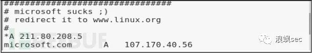 leafpad /etc/ettercap/etter.dns //通过Leafpad打开配置文件修改