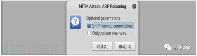 选择Mitm选项下的ARP poisoning,再在弹出的选项框中选择Sniff remote connections 进行ARP毒化攻击。