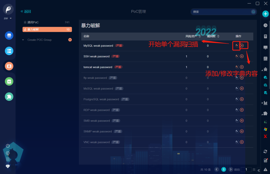 然后利用 Goby 的漏洞单扫描功能验证,点击服务后面的加号图标,结合企业里的实际业务系统情况,将用户名(员工工号或者姓名拼音)和初始密码、常用弱口令字典导入保存,然后再点击旁边的小雷达图标,就能快速对这些服务进行弱口令验证了。