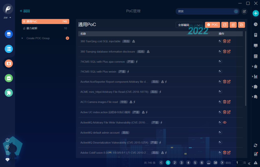 防守方首先要自查的是外围资产(暴露在互联网上可公开访问的)的安全状态,查找入口点。在这里推荐 Goby 红队版,因为红队版的 PoC 数量比社区版要多几倍,并且对于新爆发的高危漏洞 PoC 更新的比较及时,准确率也比较高。