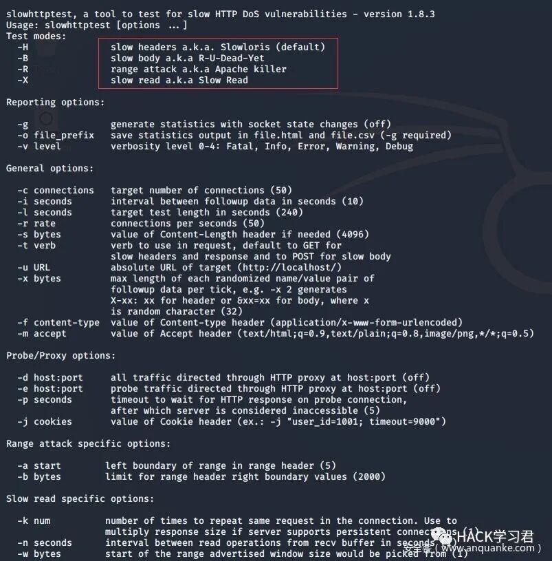 帮助说明里面告诉我们,攻击的类型支持 Slowloris 、Slow body 和 Slow read 三种,下面分别介绍。