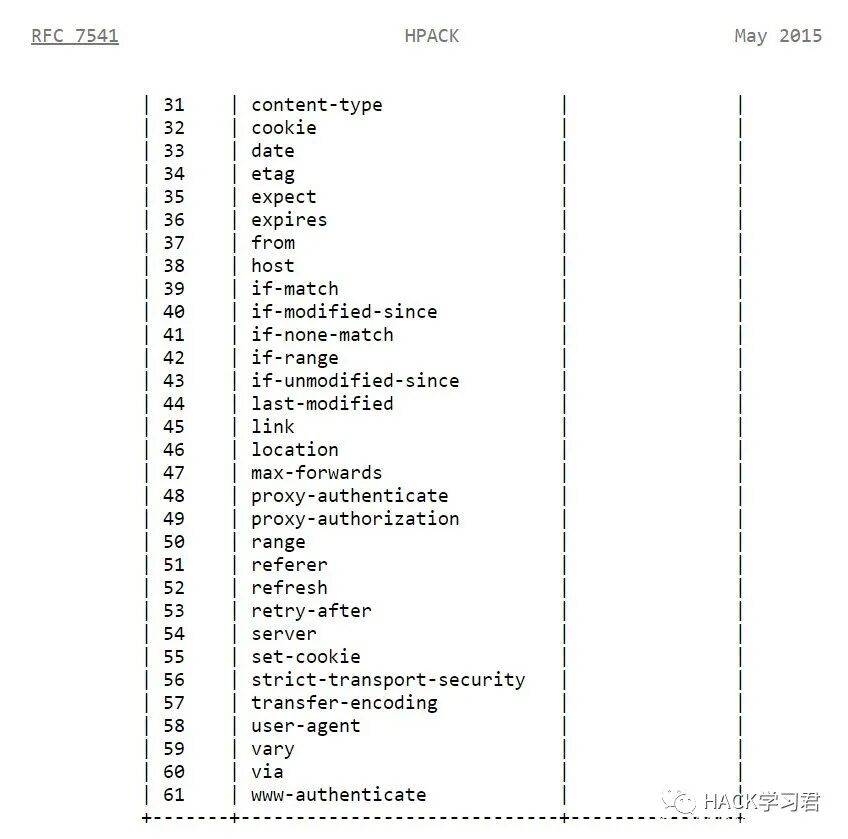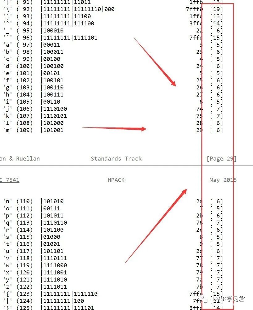 根据 RFC7541 给出的哈夫曼编码译表,我们需要关注的是最后一行的 length bit ,也就是编码的长度: