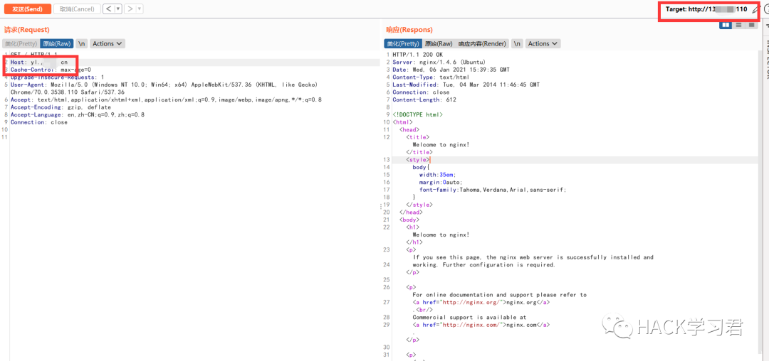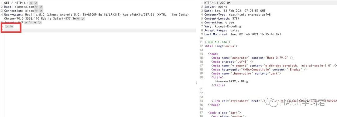 此时输入回车,再发送数据包,就可以正常得到响应了,因为用2个CRLF标记表示当前请求的HTTP头已经结束,body为空,服务器正常处理。