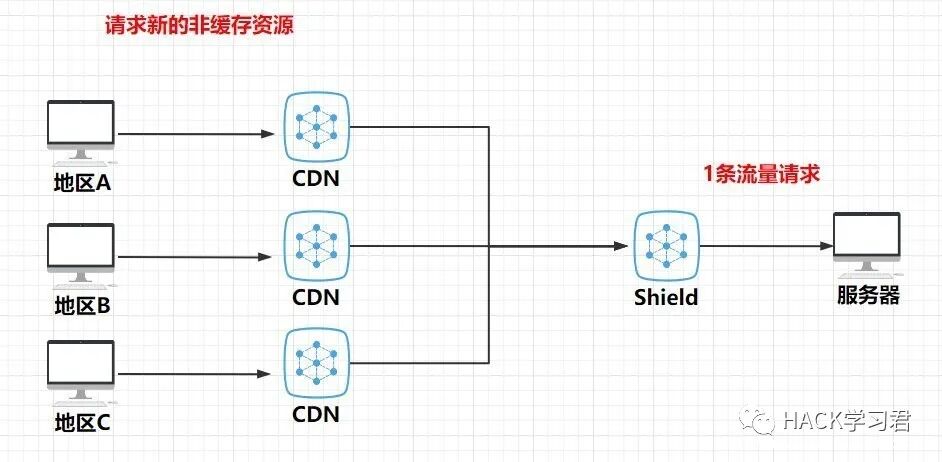 将请求流量统一整理,交由CDN厂商的Shield再去请求后端服务器获取资源,一下子就减小了对服务器的请求压力。